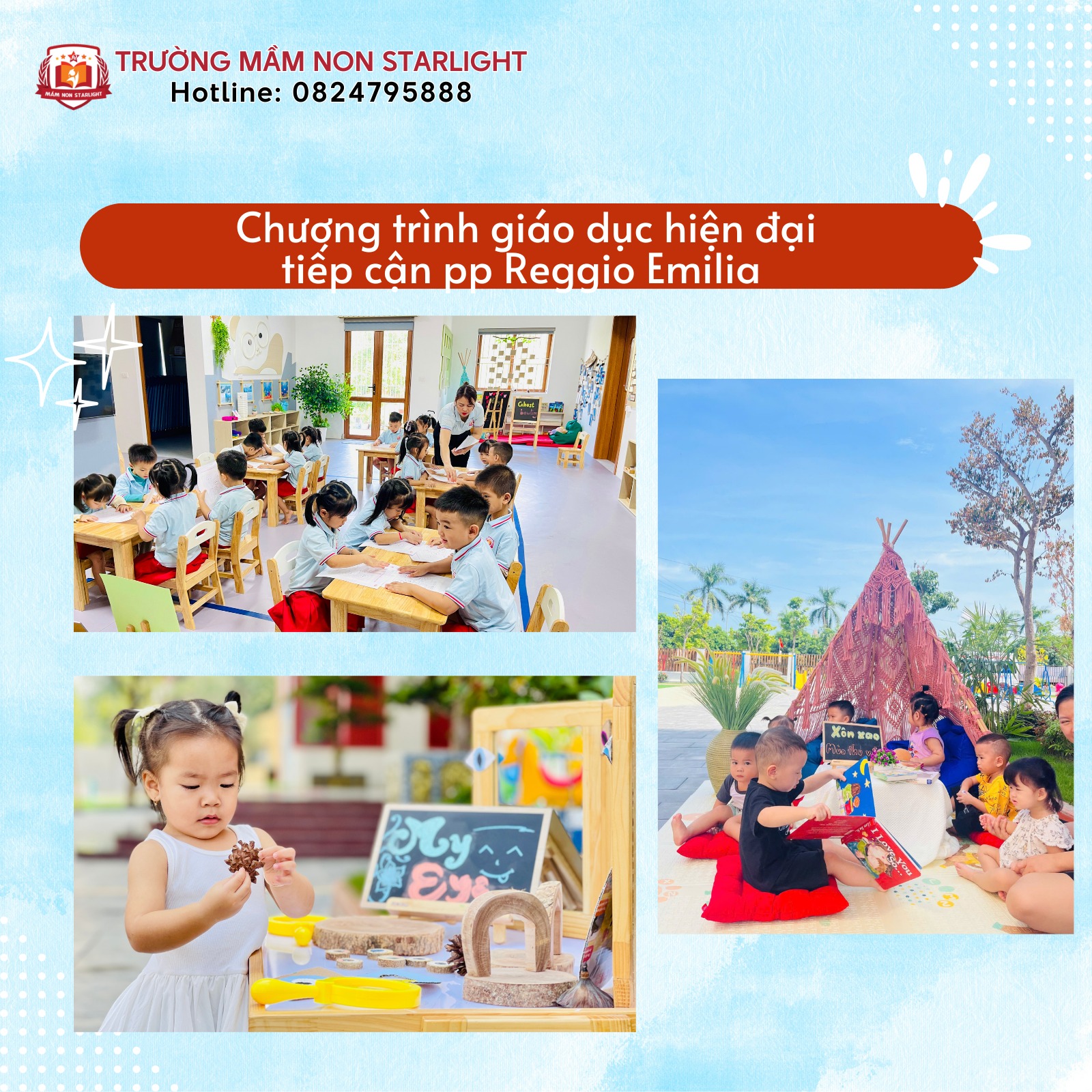 Starlight áp dụng chương trình giáo dục sớm tích hợp nhiều phương pháp tiên tiến, nổi bật là phương pháp Reggio Emilia – lấy trẻ làm trung tâm, khuyến khích sự khám phá, sáng tạo và học tập thông qua trải nghiệm thực tế. Chương trình học tập đa dạng, phong phú, bao gồm các hoạt động học tập, vui chơi, nghệ thuật và thể thao, giúp bé phát triển toàn diện các kỹ năng sống.