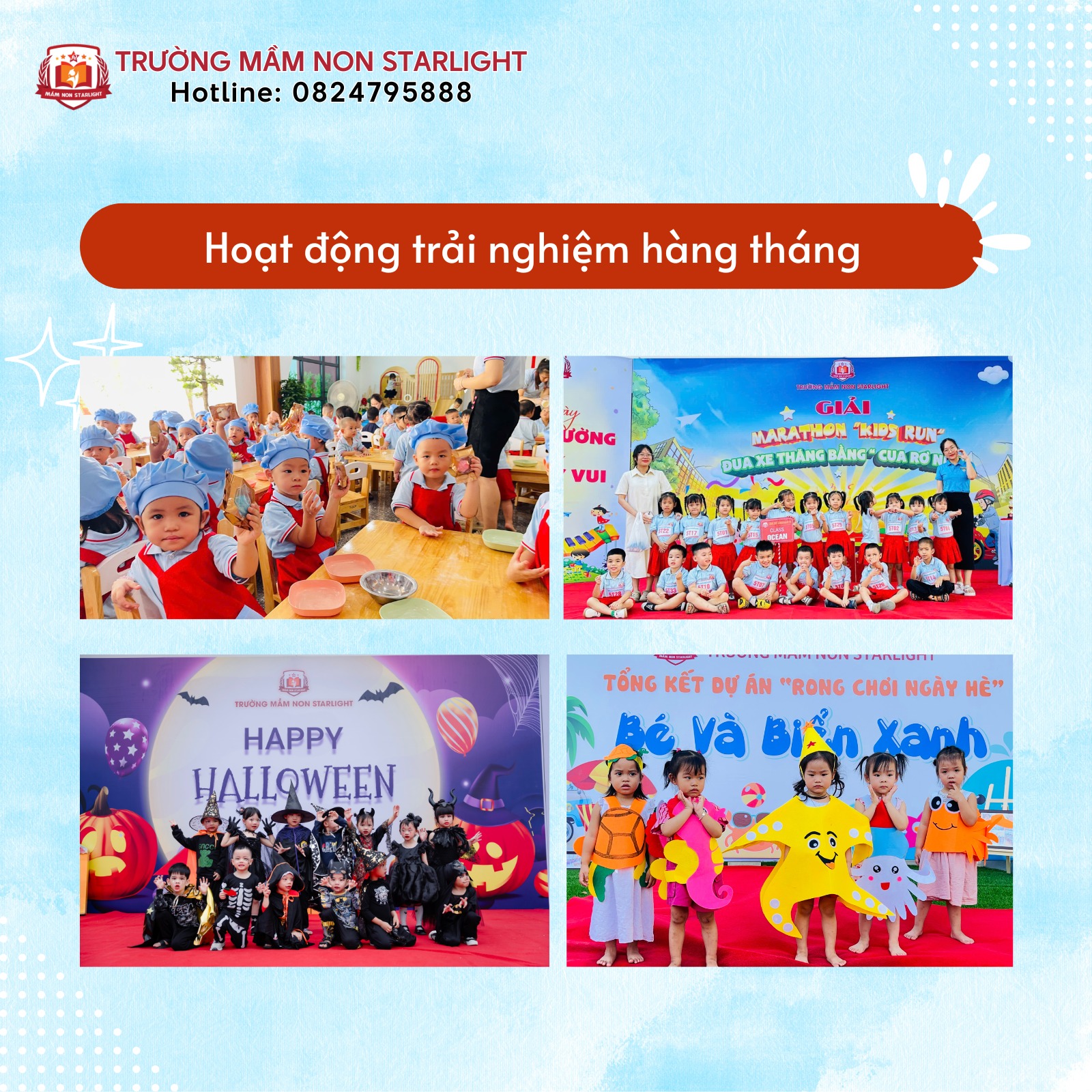 Bên cạnh chương trình học chính khóa, Starlight tổ chức nhiều hoạt động ngoại khóa bổ ích như: Yoga Kids, múa, kỹ năng sống, tham quan dã ngoại… giúp bé phát triển thể chất, rèn luyện kỹ năng và mở rộng kiến thức. Các hoạt động này được thiết kế dựa trên các dự án hàng tháng, tạo sự liên kết và trải nghiệm sâu sắc cho bé.